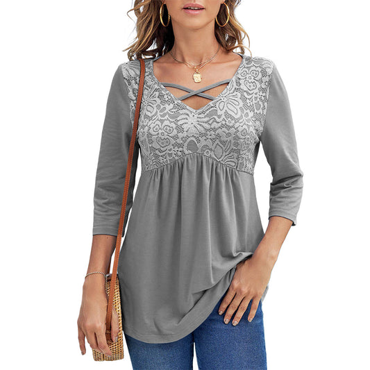 Casual Lace Stitching Women's Cross-strap Three-quarter Sleeve T-shirt