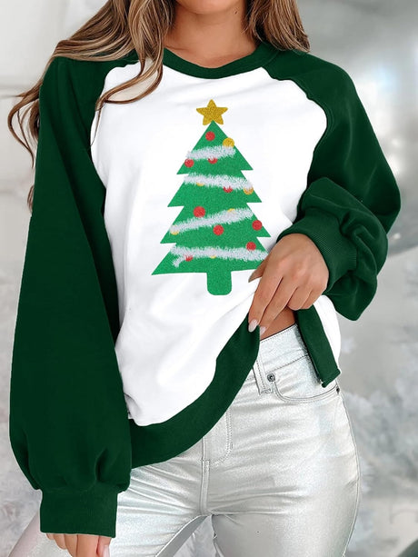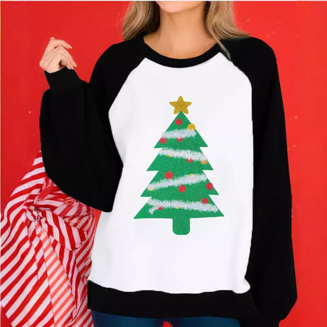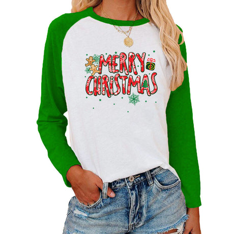 Christmas Pattern Printed Raglan Color Contrast Long Sleeve T-shirt Women