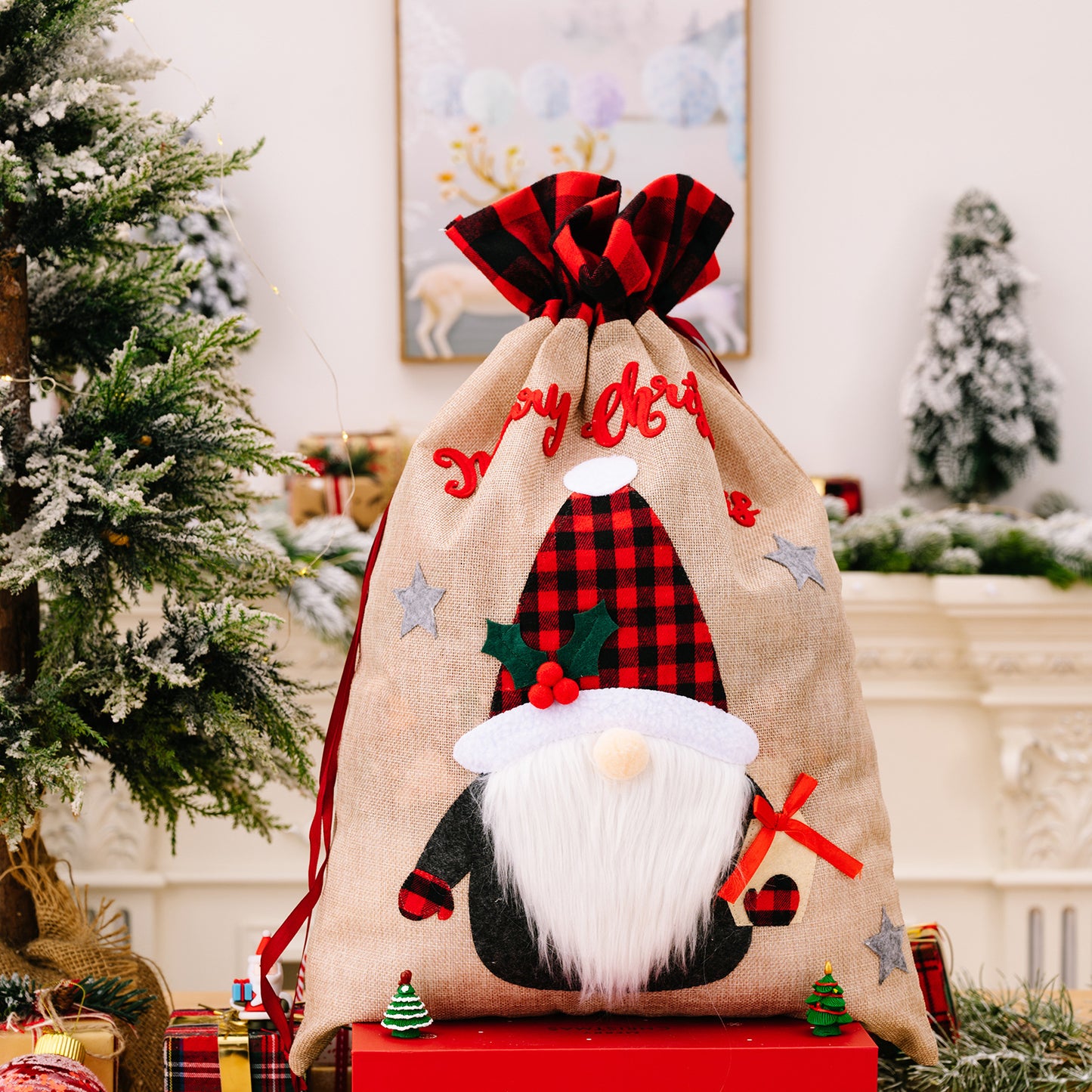 Christmas Old Man Snowman Deer Linen Plaid Gift Bag