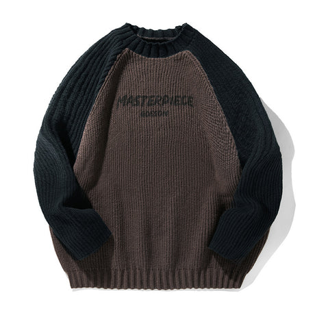 Raglan Sleeve Color Contrast Patchwork Design Sweater Thick Needle Texture American Letters