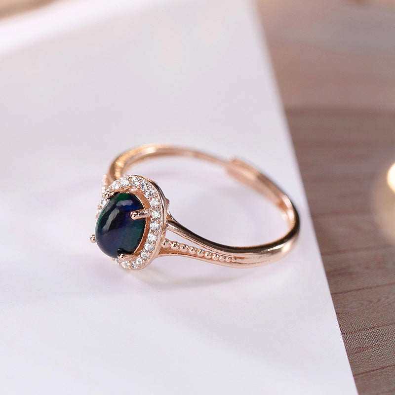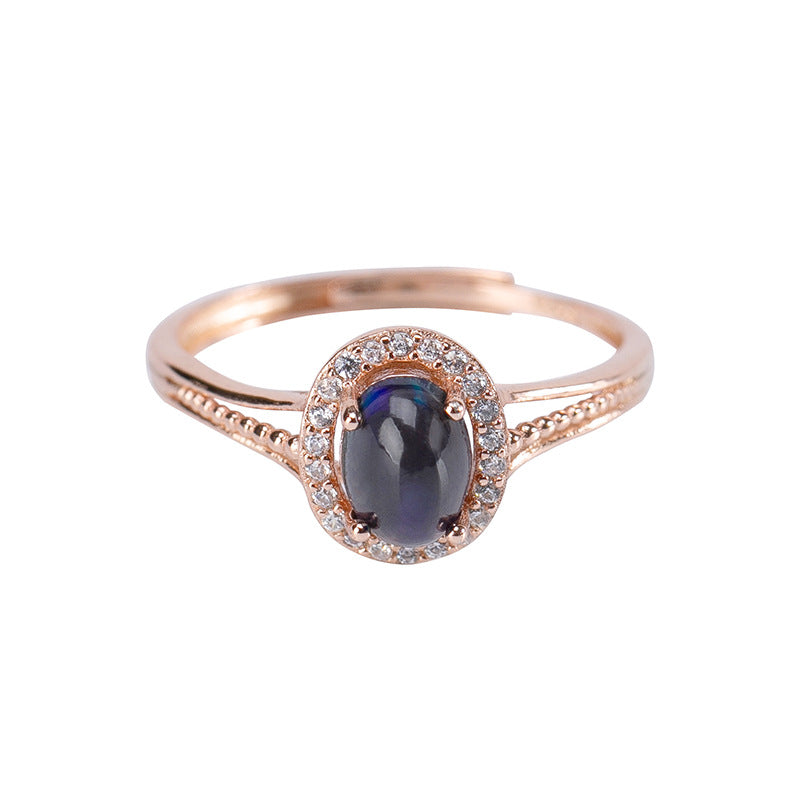 S925 純銀鍍玫瑰金鑲嵌天然黑蛋白石戒指